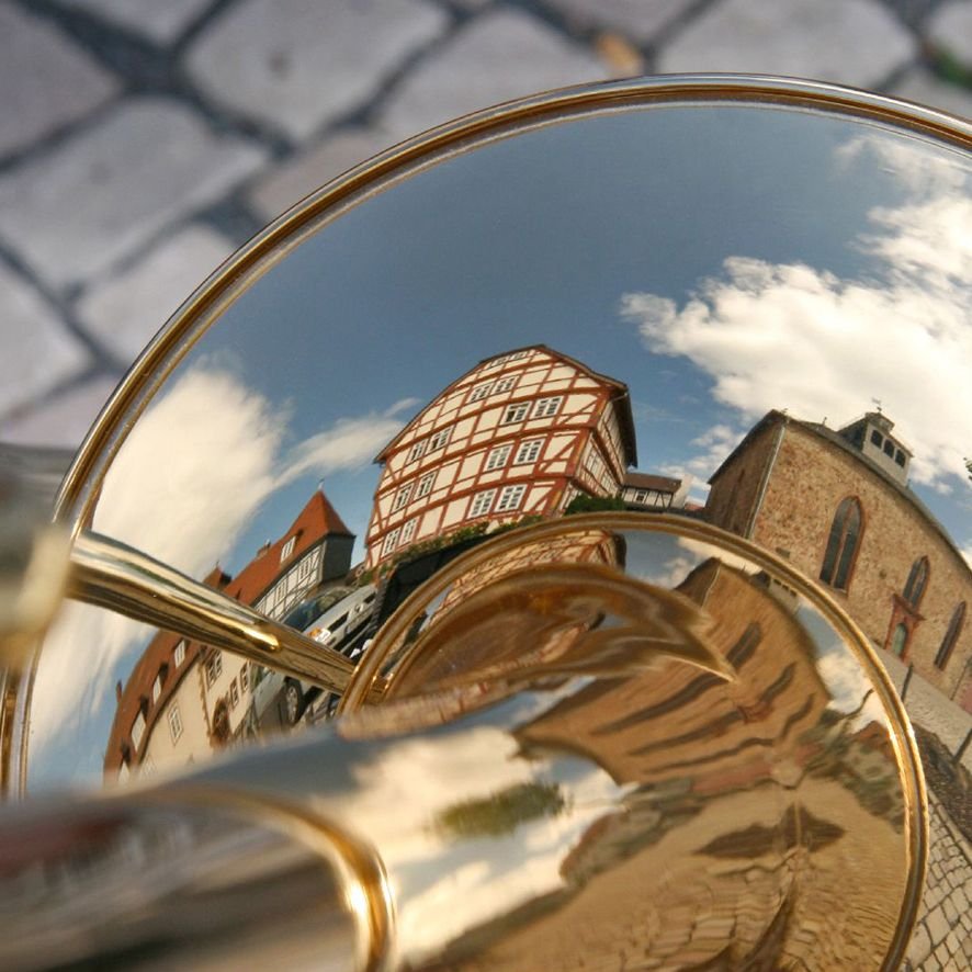 Willkommen in der Fotogalerie "Blech – mal anders". Hier kannst du Blechblasinstrumente sehen, wie du sie wahrscheinlich noch nie gesehen hast. Mein Mann und ich (wir sind beide im Posaunenchor aktiv) haben die Instrumente, die normalerweise im Posaunenchor gespielt werden, mit in die Natur genommen und dort fotografiert. Posaunenchöre haben einen großen Vorteil: Sie können problemlos draußen spielen. Ob im Park oder auf dem Marktplatz, sie packen einfach ihre Instrumente aus und legen los. Das klappt bei vielen anderen Instrumenten nicht so einfach. Deswegen wird der Posaunenchor manchmal auch scherzhaft als "Draußen-Orgel" bezeichnet. In unseren Fotos haben wir versucht, genau das zu zeigen: wie gut diese Instrumente in die Natur passen. Dabei haben wir mit Spiegelungen und Reflexionen gearbeitet. So kannst du in jedem Bild etwas Besonderes entdecken. Auch beim DEPT 2024 in Hamburg sind einige Motive entstanden. Einige der Motive haben wir mit Liedtexten aus dem evangelischen Gesangbuch kombiniert. Im Shop, in der Rubrik: „Aus der Kirchenmusik“ findest du sie z.B. in einem wunderschönen Tischaufsteller oder als Grußkarte. Viel Spaß beim Betrachten & Stöbern!