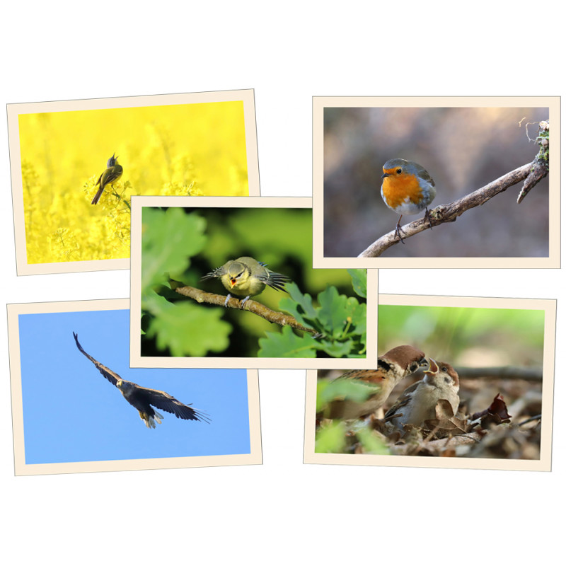 Für Vogelfans! Fünf Karten mit jeweils einem Vogelmotiv (Rotkehlchen, Blaumeise, Schafstelze, Seeadler, Feldsperling), universell einsetzbar und immer passend (inkl. Briefumschlägen, einfarbig beige, nicht abgebildet).