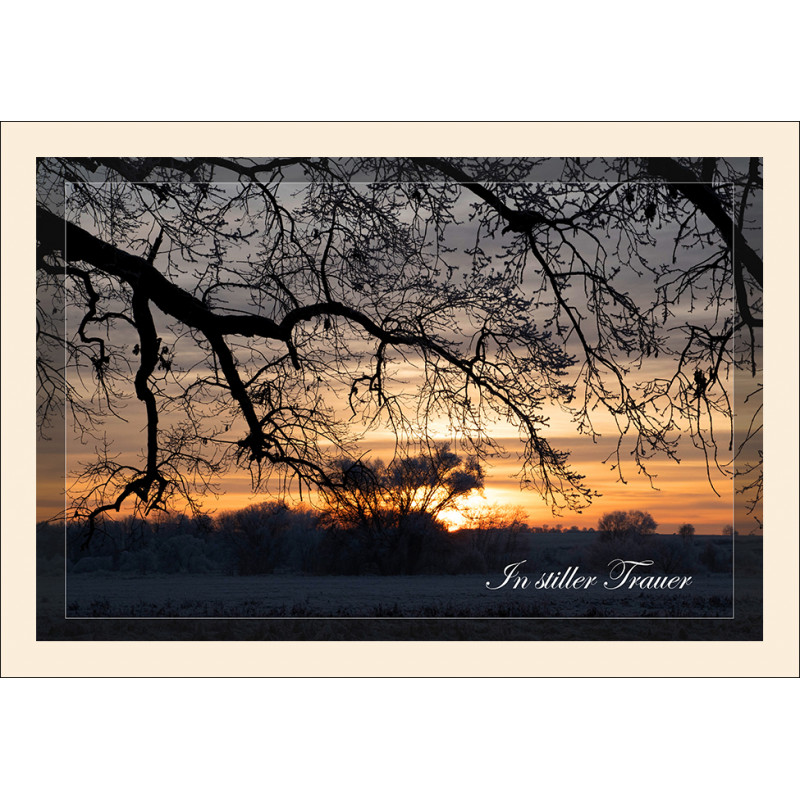 Äste eines alten Baumes ragen im letzten Licht des Tages über einer verschneiten Winterlandschaft (inkl. Briefumschlag, einfarbig beige, nicht abgebildet).