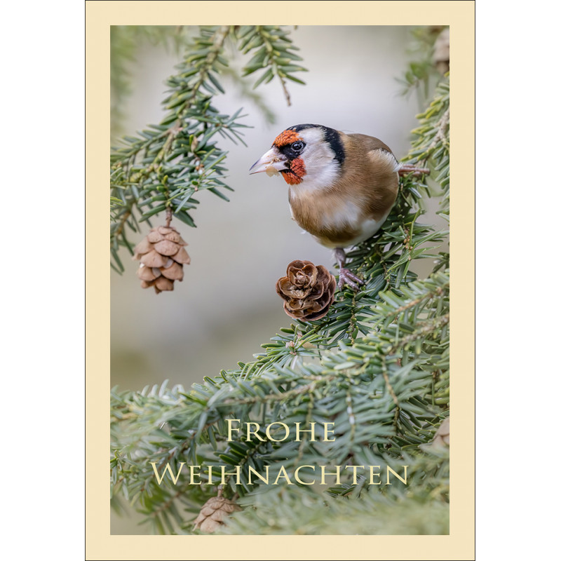 Eine festliche Weihnachtskarte mit einem Stieglitz, der mit seinem bunten Federkleid Weihnachtsfreude in jedes Zuhause bringt (inkl. Briefumschlag, einfarbig beige, nicht abgebildet).